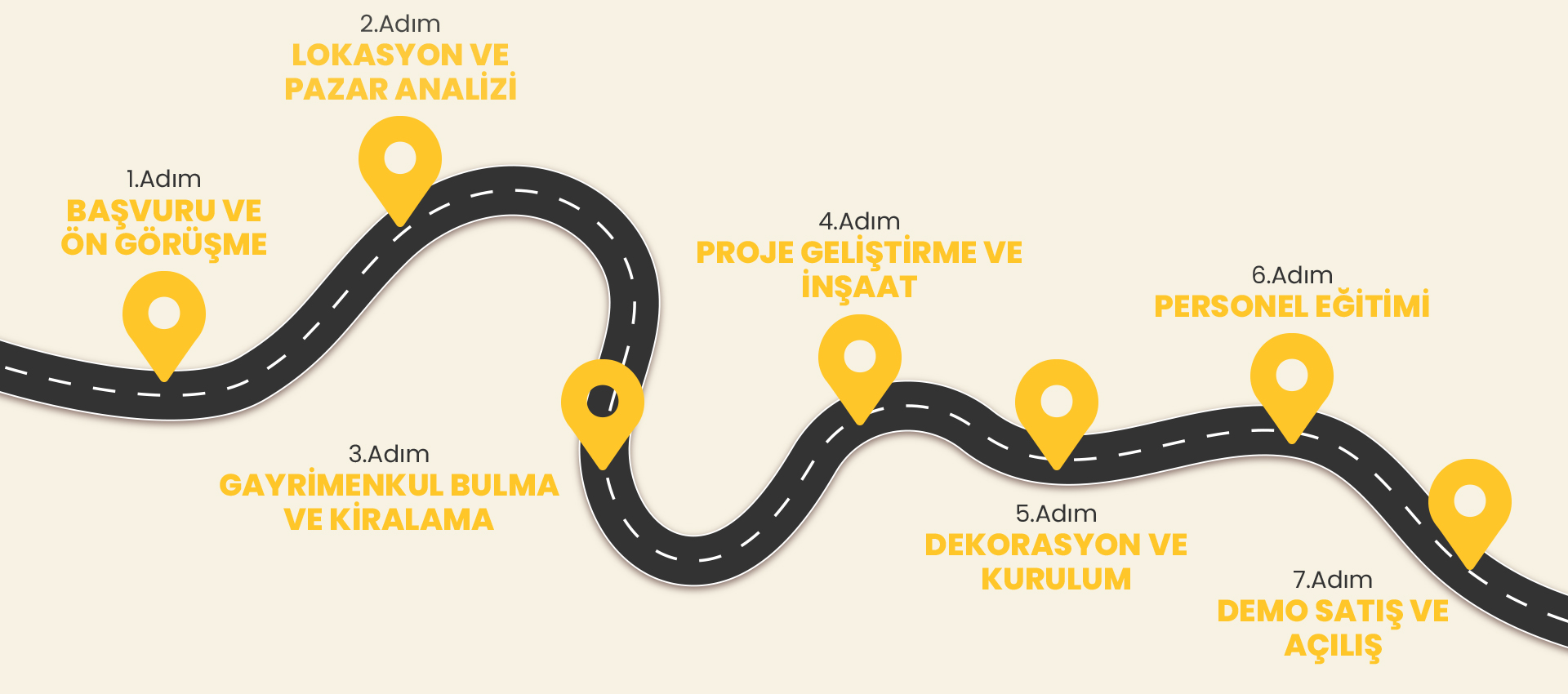 Lokasyon seçimi, planlama, işe alım, eğitim, operasyon ve pazarlamaya kadar her aşamada tam destek sağlıyoruz. Açılış öncesi, açılış ve açılış sonrasındaki tüm süreçlerinizde markamızın gücünü hissettiriyoruz.